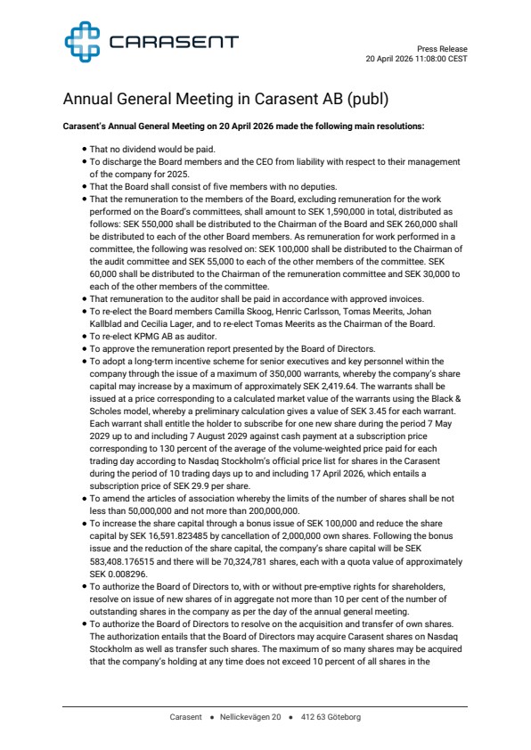 Carasent’s Annual General Meeting on 20 April 2026 made the following main resolutions: