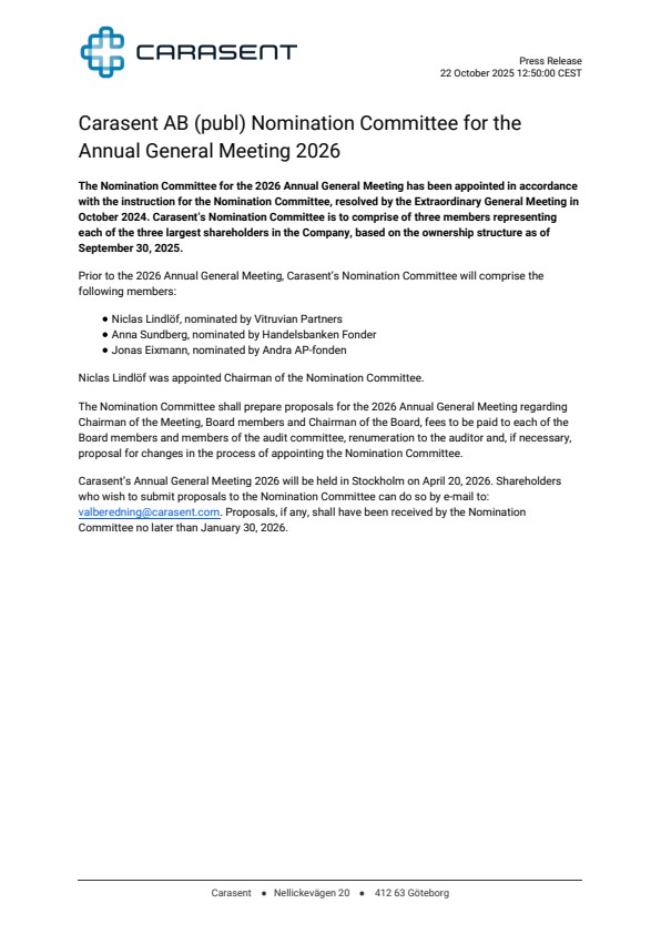 Carasent’s Annual General Meeting 2026 will be held in Stockholm on April 20, 2026. Shareholders who wish to submit proposals to the Nomination Committee can do so by e-mail to: valberedning@carasent.com. Proposals, if any, shall have been received by the Nomination Committee no later than January 30, 2026.
