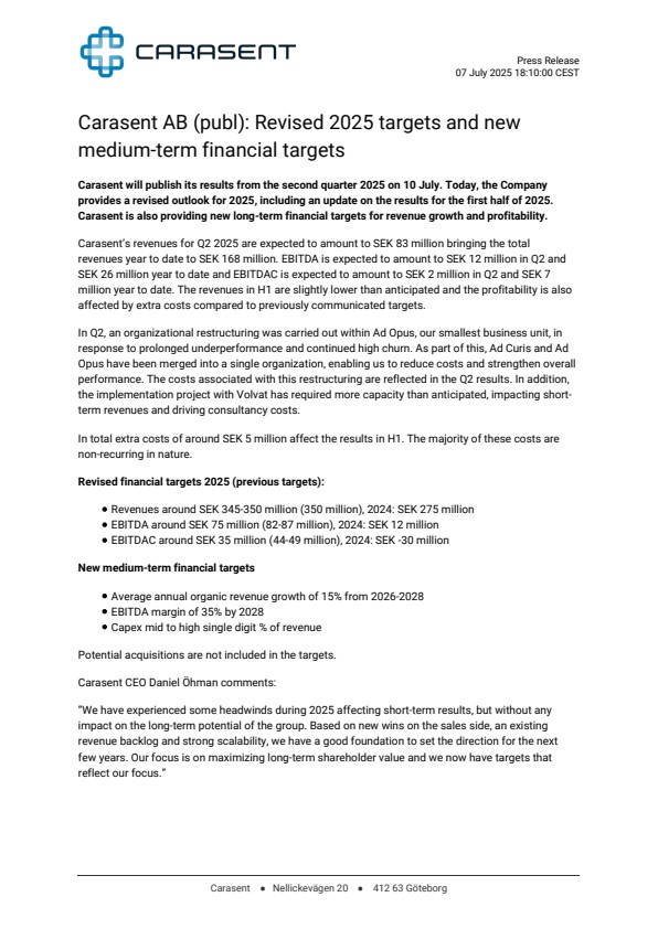 Carasent will publish its results from the second quarter 2025 on 10 July. Today, the Company provides a revised outlook for 2025, including an update on the results for the first half of 2025. Carasent is also providing new long-term financial targets for revenue growth and profitability.
