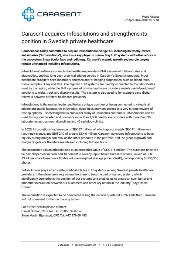 Carasent has today committed to acquire Infosolutions Sverige AB, including its wholly-owned subsidiaries (“Infosolutions”), which is a key player in connecting EHR systems with other actors in the ecosystem, in particular labs and radiology. Carasent’s organic growth and margin targets remain unchanged including Infosolutions.