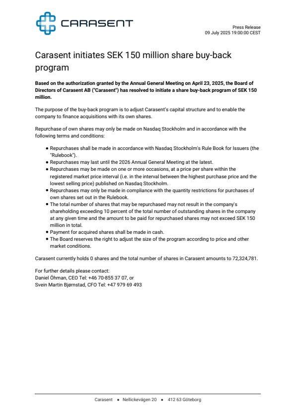 Based on the authorization granted by the Annual General Meeting on April 23, 2025, the Board of Directors of Carasent AB (“Carasent”) has resolved to initiate a share buy-back program of SEK 150 million.