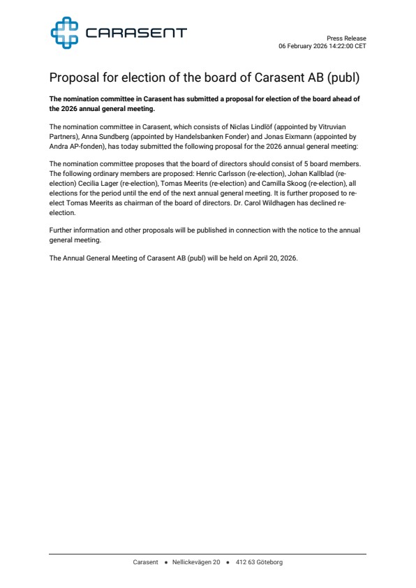 The nomination committee in Carasent has submitted a proposal for election of the board ahead of the 2026 annual general meeting.