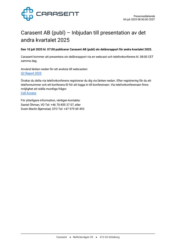 Den 10 juli 2025 kl. 07:00 publicerar Carasent AB (publ) sin delårsrapport för andra kvartalet 2025.